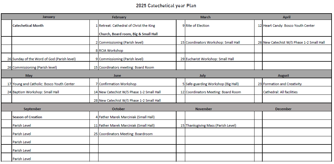 All catechesis in the Diocese, according to the directives of the South African Catholic Bishops Conference of 1998, has as its norm and vision the baptismal catechumenate.